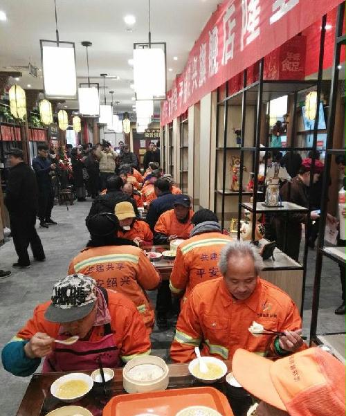 上午10点左右,绍兴店正式开门迎客。但最先吃到热腾腾包子的,是城区从事马路清扫的一线环卫工人,总数有50多名。每人一屉猪肉大葱包子、一碗南瓜粥,一碟泡菜,一个点心奶油炸糕。“来来来,大家辛苦了,趁热吃吧!”负责绍兴店经营管理的浙江南方庆丰餐饮管理有限公司总经理高文慧亲自当起了“跑堂”,为一桌桌的环卫工人送上一份份暖意。“‘积善余庆,国富民丰’是我们庆丰包子铺的企业文化理念,体现的是一个善文化,所以我们每家新店开业,做的第一锅包子都是做公益的,绍兴店当然也不例外。”高文慧说。